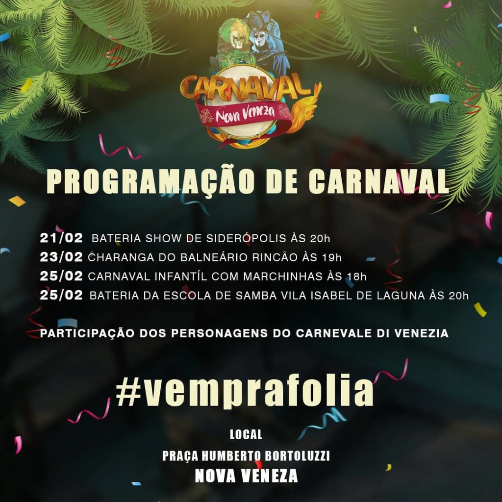 É carnaval e Nova Veneza preparou uma programação especial para quem vai curtir o feriadão na cidade mais italiana do Brasil. A tarantela vai dar lugar para o samba e a programação inicia na sexta-feira, 21, até terça-feira de carnaval. Confira a programação e vem pra folia.
