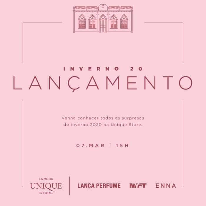 No sábado, 7, a moda invade a cidade com o lançamento Inverno 20 na loja Unique Store com as marcas Lança Perfume, MYFT e ENNA, às 15h. Dica especial para conhecer as surpresas e tendências do inverno 2020.