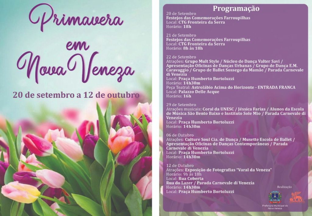Para comemorar a chegada da época mais colorida e florida do ano na Capital Nacional da Gastronomia Típica Italiana será realizada a segunda edição da Primavera em Nova Veneza de 20 de setembro a 12 de outubro, em Nova Veneza. Uma decoração especial com flores artesanais irá enfeitar alguns pontos da cidade. Além de uma programação cultural com dança, música, teatro e exposição nos finais de semana. Paralelo a programação, acontecerão também os festejos das comemorações Farroupilhas, nos dias 20 e 21 de setembro, a partir das 18h, no CTG Fronteira da Serra.