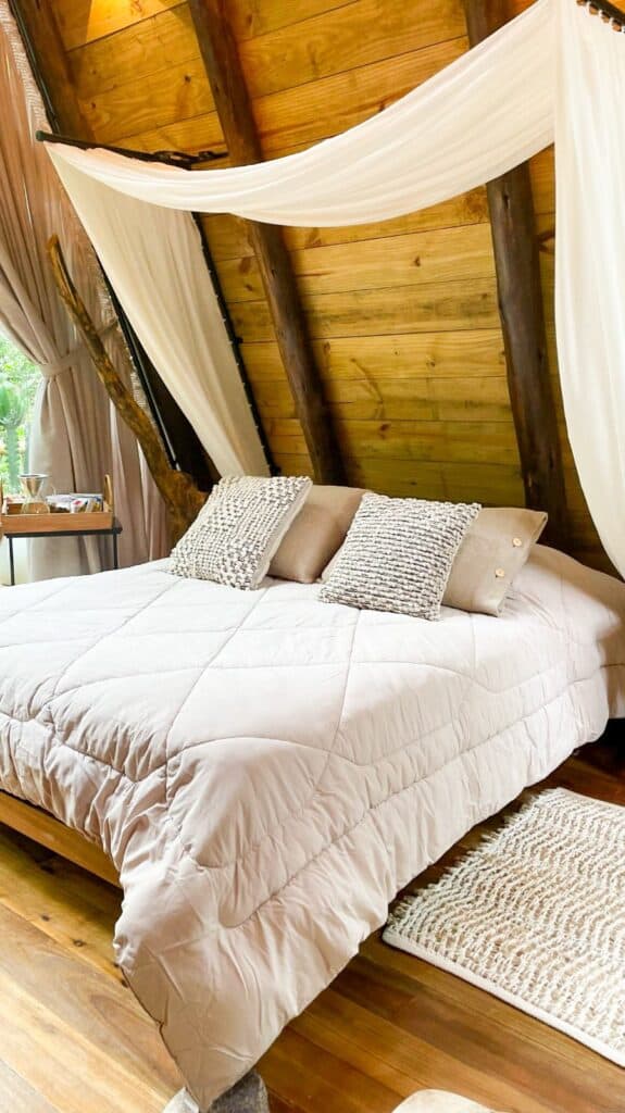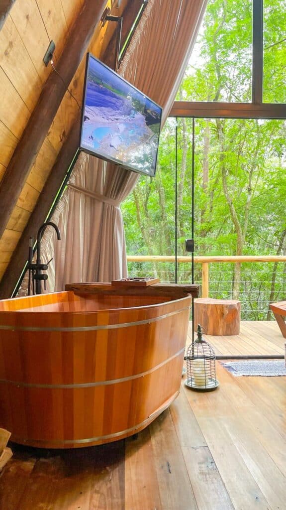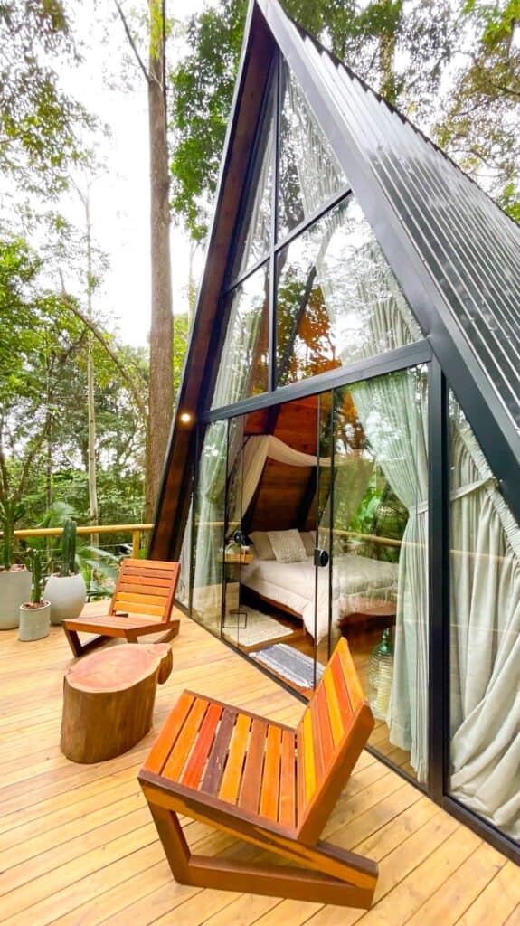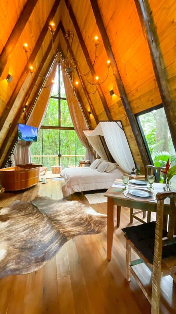 Entre as opções estão as Cabanas Caeté e Cipó que ficam rodeada pela mata exuberante. No interior luxo e conforto com itens de qualidade para receber os hóspedes. A propriedade de cerca de 6 hectares de mata nativa possibilita a observação de plantas, árvores e pássaros em uma experiência única de isolamento e relaxamento.