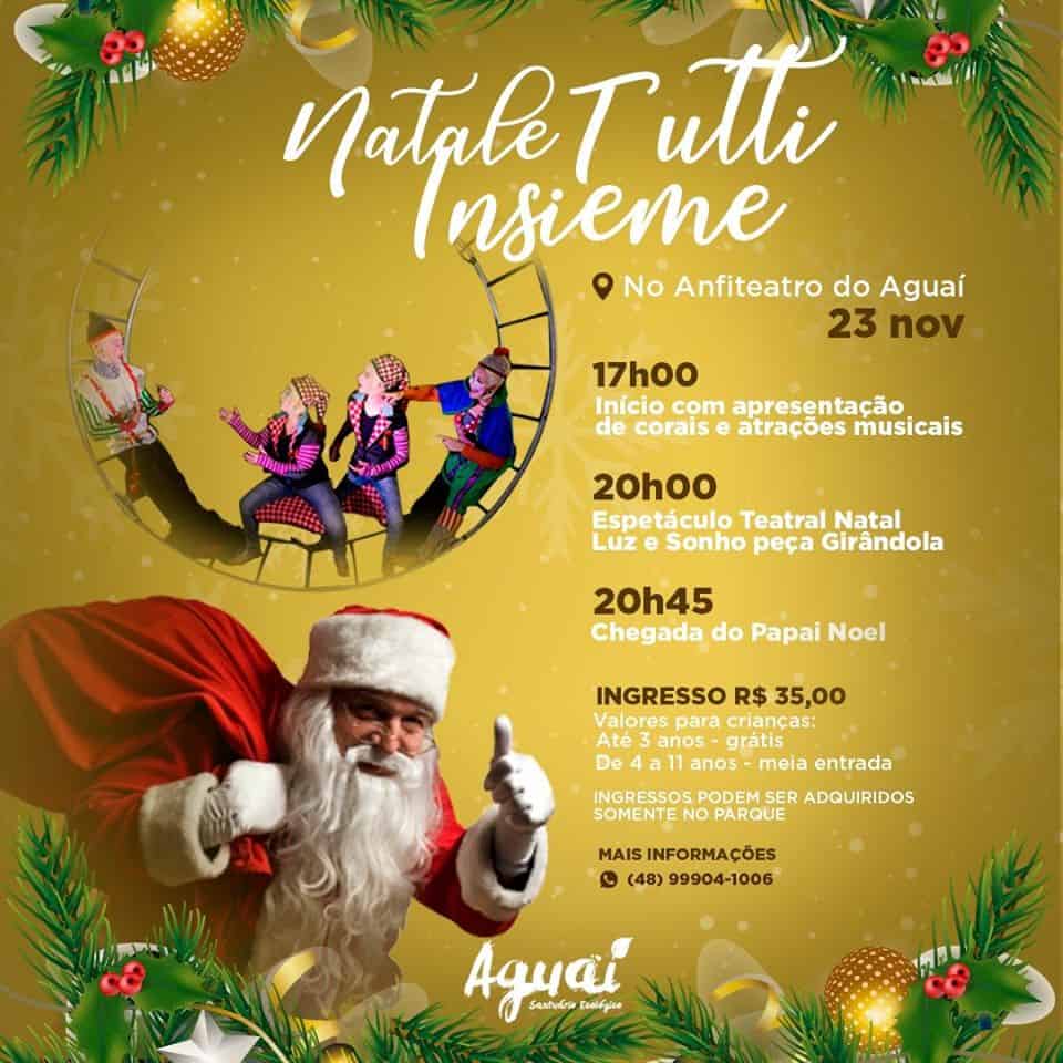 Natale Tutti Insieme, acontece neste sábado, 23, e será o evento de inauguração do anfiteatro do Aguaí Santuário Ecológico, em Siderópolis, com programação a partir das 17h. O evento contará com apresentações culturais e musicais, além de iluminação especial em um ambiente cercado pela natureza. O anfiteatro é uma obra arquitetônica que resultará ainda mais visibilidade a região e em contrapartida atraindo ainda mais turistas.