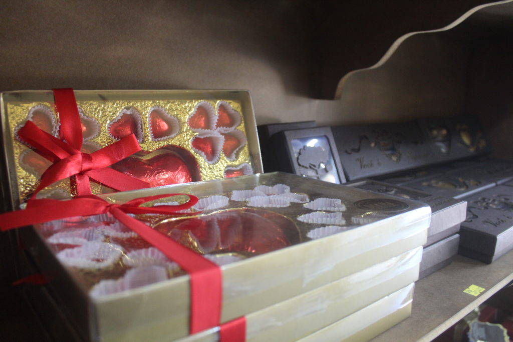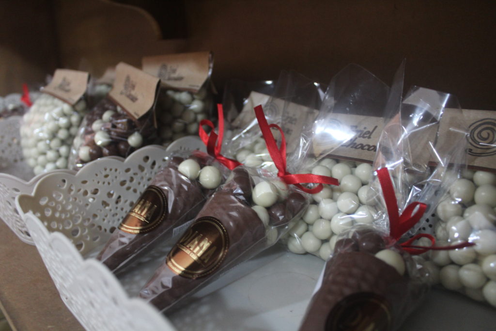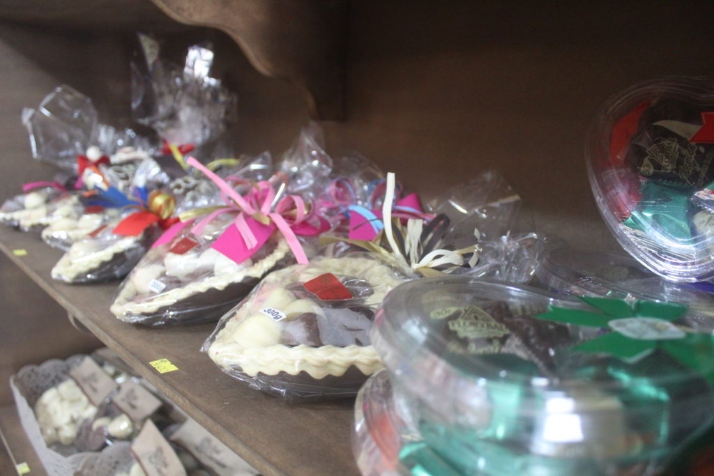 A loja também conta com drageas, ou popularmente conhecidos como crocantes, barra comemorativas e corações de chocolate ideal para presentes.