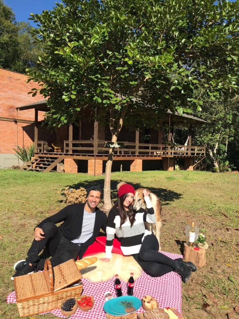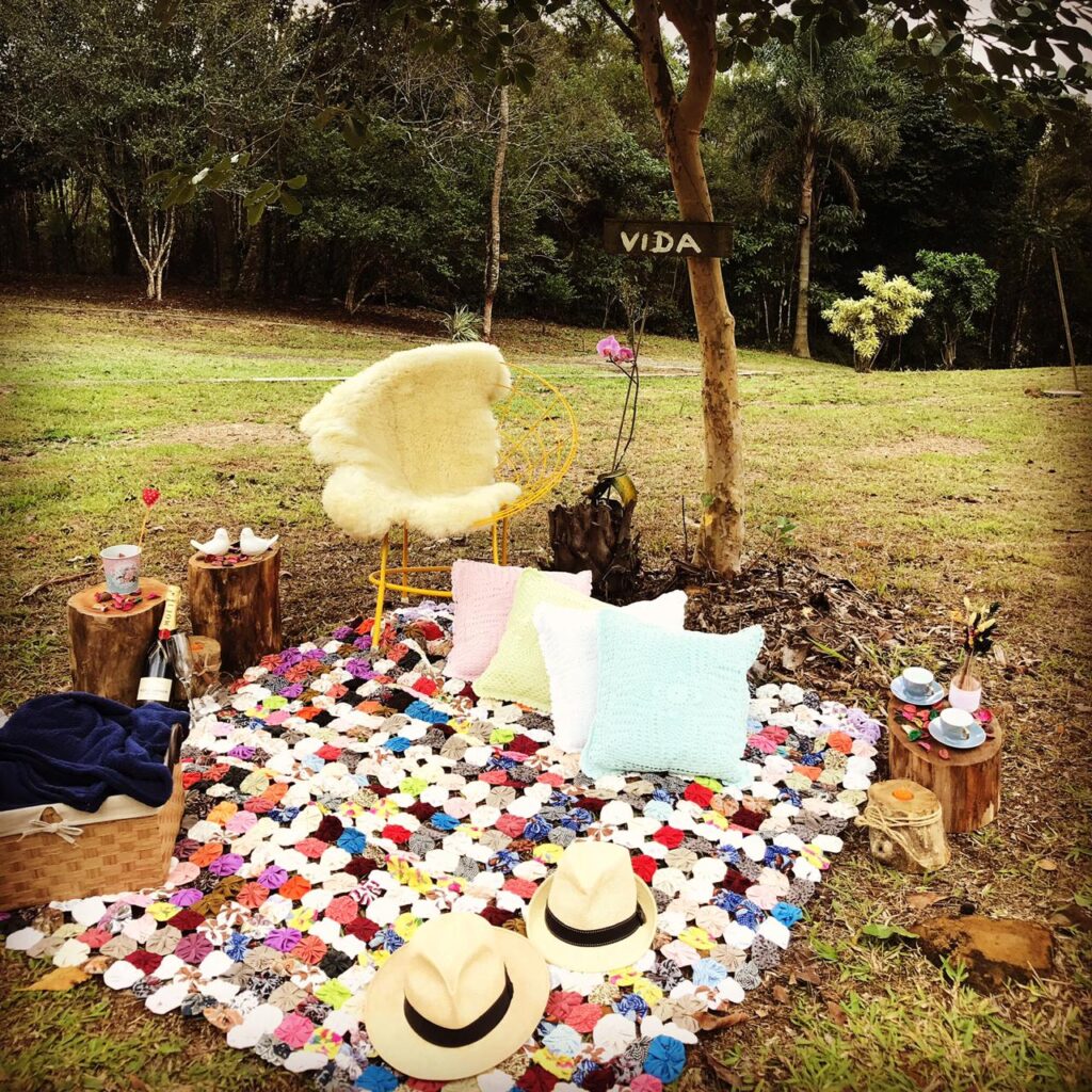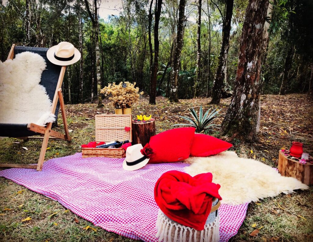 O piquenique tem produção dos anfitriões da pousada e cada cenário é pensado nos mínimos detalhes com toalha estendida no chão, almofadas, tocos de árvores, cesta e outros itens para decorar o ambiente.