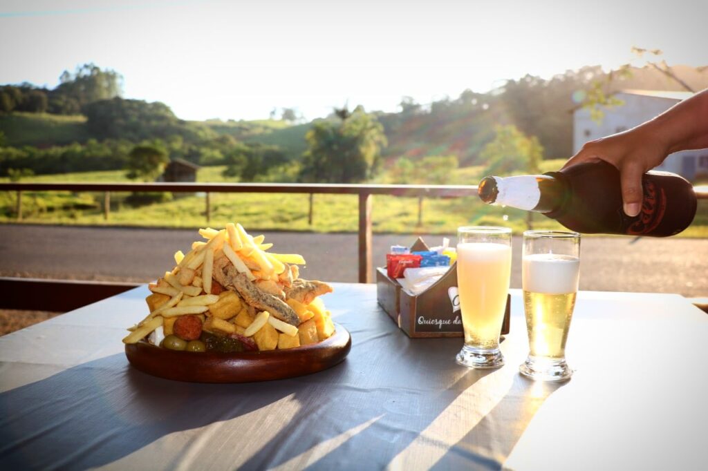 Um happy hour é a opção diferente para curtir no Quiosque da Célia com porções deliciosas. Além das receitas, o restaurante fica localizado em um recanto da natureza no interior de Nova Veneza.