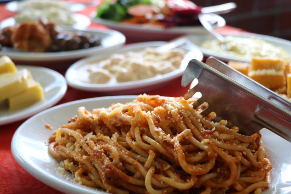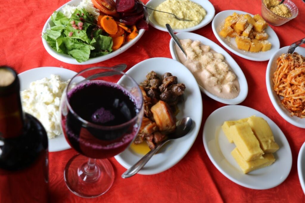 como o espaguete à bolonhesa e o nhoque ao molho rosé. Seguindo as tradições um delicioso churrasco no espeto corrido é o destaque com cortes selecionados.
