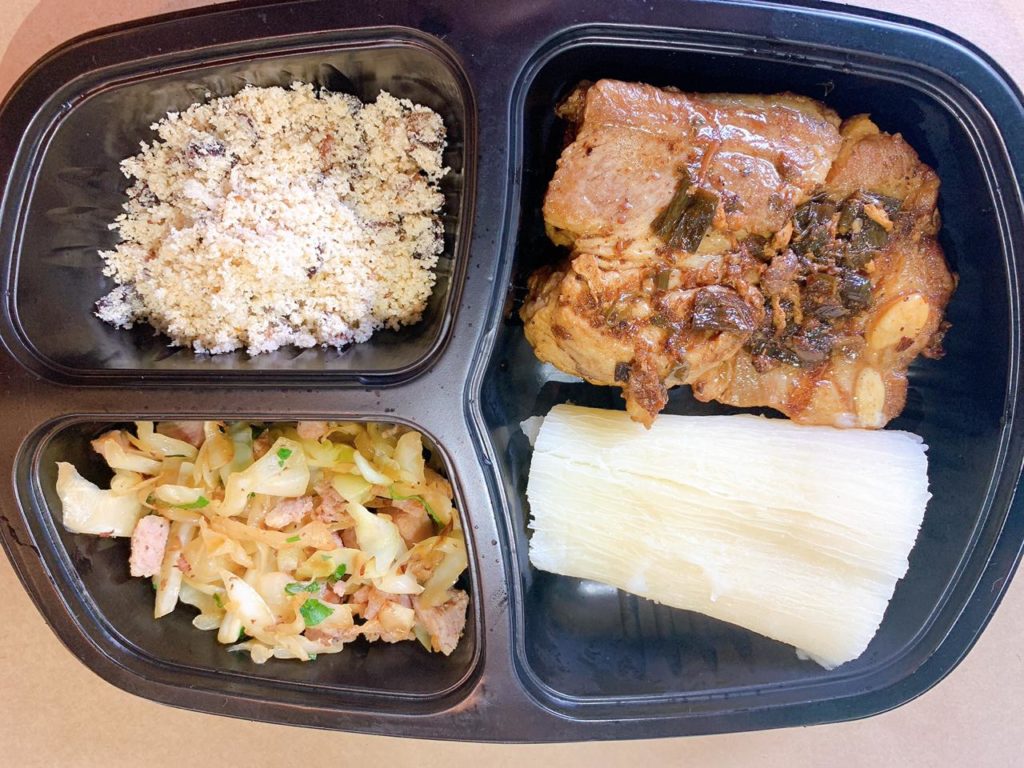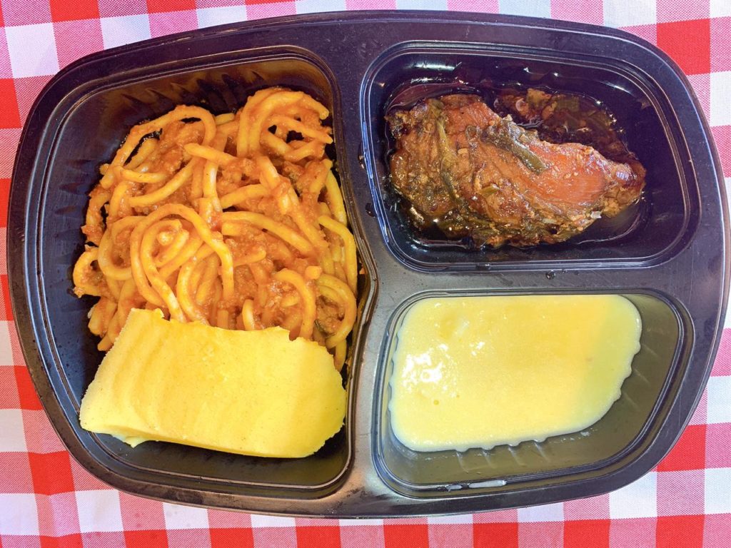 O restaurante oferece opções deliciosas para o almoço durante a semana para buscar.