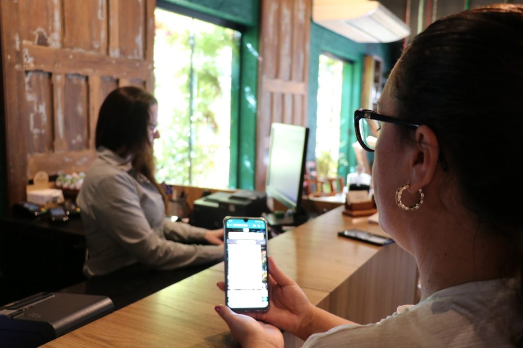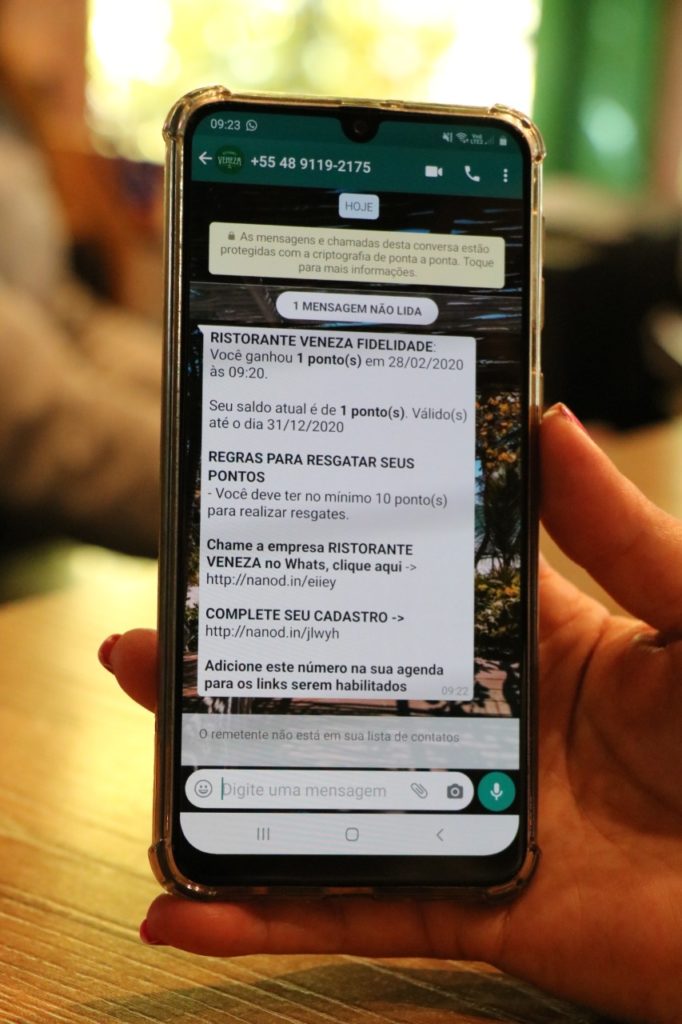 O cadastro é realizado em um aplicativo e a pontuação é enviada por mensagem, via WhatsApp.